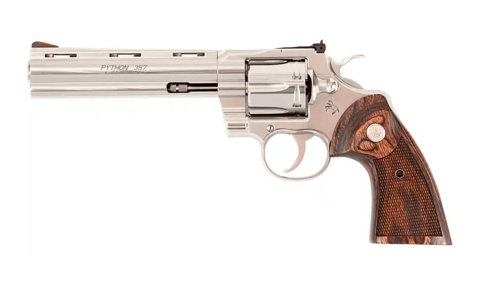 Colt’s Manufacturing Company stellte den Python 1955 in Hartford, Connecticut, erstmals vor. Was folgte, war eine Goldene Ära handwerklicher Revolverbaukunst: Erfahrene Büchsenmacher stimmten jeden einzelnen Abzugsmechanismus von Hand ab, feilten und polierten jedes Exemplar individuell – ein Aufwand, der bis zur Einstellung der Produktion 1999 Bestand hatte. Nach 21 Jahren Pause brachte Colt den Python 2020 in einer komplett überarbeiteten Neuauflage zurück. Modernisierte CNC-Fertigungsverfahren ersetzen die frühere Handarbeit, doch das klassische Design blieb bewusst erhalten.