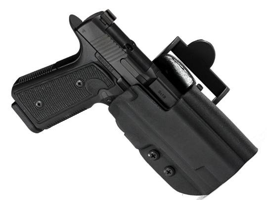 Das Griffstück ist einteilig aus Aluminium gefertigt und nicht modular austauschbar – anders als etwa bei der Sig Sauer P320. Die G10-Griffschalen sorgen für einen verwindungsfreien, rutschfesten Sitz auch bei feuchten Händen. Der Rückengurt ist ergonomisch neu gestaltet und vermeidet Einklemmstellen beim Schuss. Zusammen mit dem aus der 1911 bekannten Griffwinkel ergibt das eine natürliche Handlage, die viele Schützen als intuitiver empfinden als den steileren Griffwinkel moderner Polymer-Pistolen.