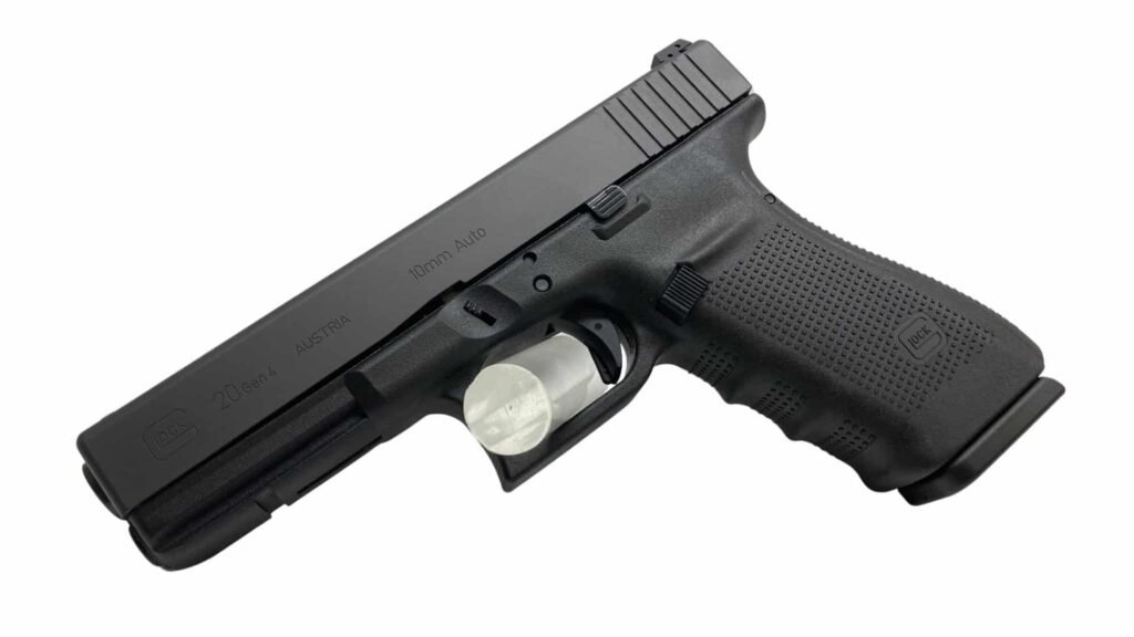 Das Polymergriffstück der Glock 20 ist nicht nur leicht, sondern auch hochfunktional: Die Hi-Tech-Polymerformulierung mit Glasfasern bietet hervorragende Rückstoßdämpfung, Wetterbeständigkeit und Langlebigkeit. Die Konstruktion ist wartungsarm und feldtauglich – eine Waffe, die auch unter rauen Bedingungen zuverlässig funktioniert. Der Stahlschlitten und der verchromte Schlagbolzen sind ebenfalls robust ausgelegt, und modernere Generationen profitieren von zusätzlichen Verbesserungen in Material und Oberflächenbehandlung.