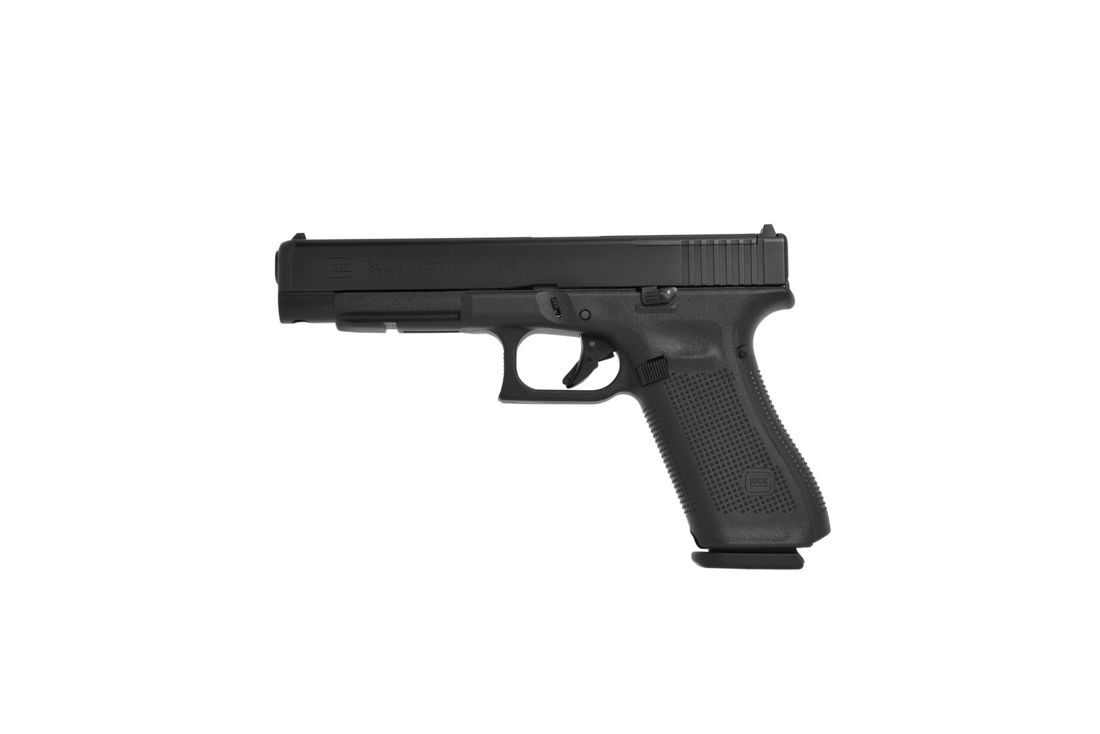 Die Glock 34 basiert auf dem bewährten Safe-Action-System mit drei automatischen Sicherungen (Abzugsicherung, Schlagbolzensicherung und Fallsicherung). Der Polymerrahmen hält das Leergewicht bei etwa 728 Gramm (Gen4) bis 735-743 Gramm (Gen5 mit leerem Magazin) – deutlich leichter als Stahlkonkurrenzmodelle. Die Lauflänge von etwa 135 Millimetern macht die Glock 34 fünf Zentimeter länger als die Standard-Glock 17, was die Visierlinie verlängert und damit Präzision erhöht.