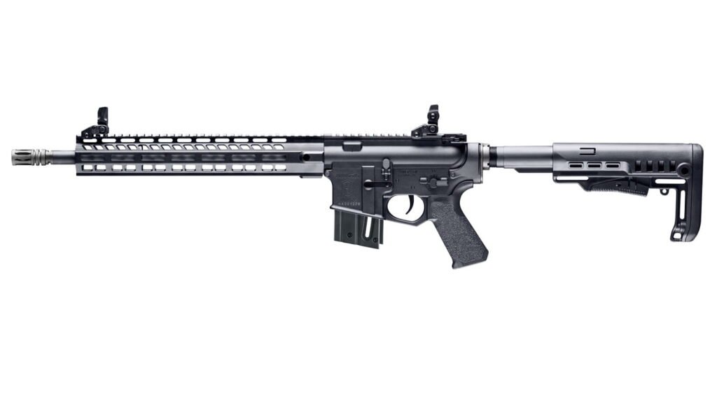 Der 40,9 cm lange Lauf ist mit einem Mündungsgewinde 1/2-28 UNEF ausgestattet. Die Büchse ist mit einem M-LOK-Handschutz versehen, der flexible Anbaumöglichkeiten für Zubehör ermöglicht. Der Kunststoffschaft lässt sich fünffach in der Länge verstellen, um die Waffe an unterschiedliche Schützenstatur anzupassen.