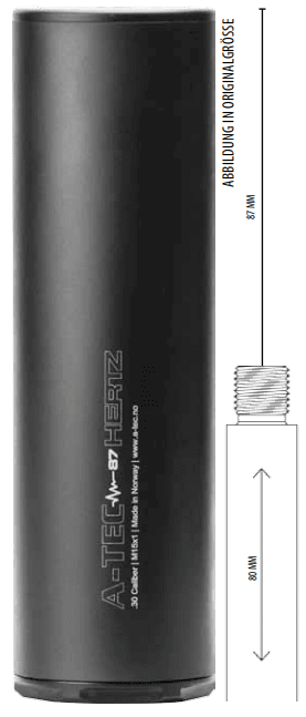 Der A-Tec Hertz 87 ist ein ultrakompakter Schalldämpfer des Herstellers A-Tec mit lediglich 87 mm Baulänge – konzipiert für Nachsuchwaffen und Kurzwaffen, bei denen Handlichkeit und geringe Verlängerung kritisch sind. Charakteristische Merkmale sind die Magnum-Tauglichkeit, die durchschnittliche Schallreduktion von ca. 22 dB sowie die vielseitige Kompatibilität mit gängigen Mündungsgewinden (1/2-28 UNEF, 1/2x20 UNF, 5/8x24, M13x1 bis M18x1). Die tatsächliche Dämpfleistung variiert abhängig von Kaliber, Lauflänge und Munitionsart.