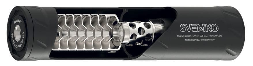 Der Svemko Magnum Quick Mount ist ein Premium-Schalldämpfer des norwegischen Herstellers Svemko, speziell entwickelt für starke Magnum-Kaliber. Die Konstruktion überzeugt durch modularen Aufbau mit einer Außeneinheit und einem komplett aus Titan 5 (Ti6Al4V) gefertigten Innenmodul.